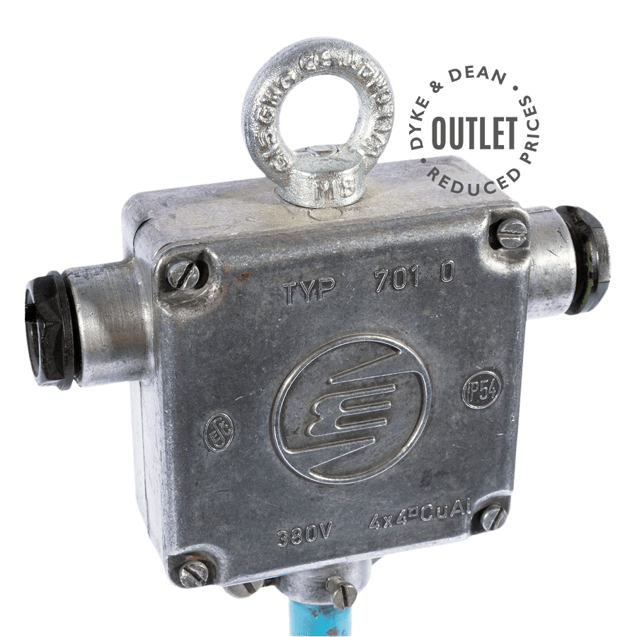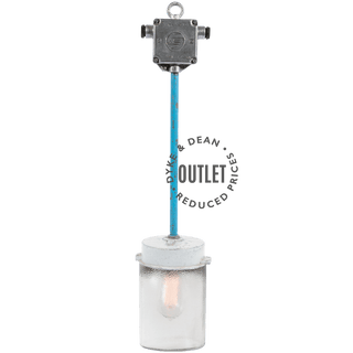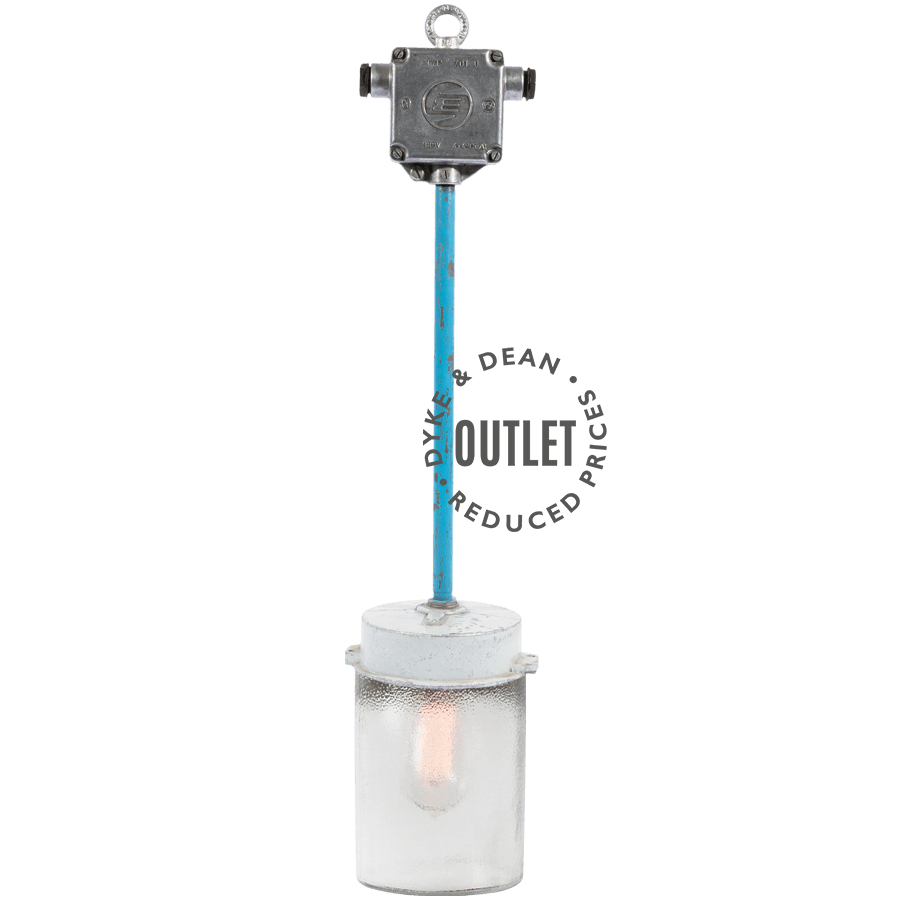 These lights were imported from Poland around 8 years ago for our store fit. Unusual version of a known Czech design with extended blue rod sections. Can be used as single pendants or daisy chained together with the side entry holes. Extremely tough lights salvaged from the former Eastern Bloc was produced in the manufacturing powerhouses of former Czechoslovakia.