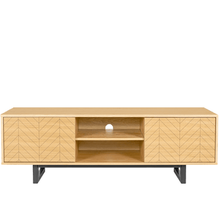 Mobile impiallacciato in rovere con stampa nera sulle ante, gambe in legno massello tinto nero. Disegno a spina di pesce stampato con inchiostro nero sulle ante che si aprono con sistema push-to-open. Dietro le ante e al centro c'è un ripiano regolabile (L47/P36 cm.) Altezza interna 32 cm. C'è un foro per i cavi nella parte centrale aperta. Altezza gambe 15 cm. Il limite di peso del prodotto è di 60 kg.