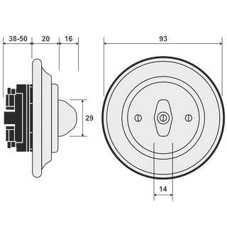 250 V / 16 A, il passo minimo dei centri delle scatole di installazione nascosta è 100 mm (min. 95 mm), profondità della scatola 68 mm. Progettato per pareti intercapedini e pareti piene. Aggiungere la scatola di cablaggio che non è inclusa nel prezzo. Si prega di notare che con questo interruttore è necessaria una profondità della scatola posteriore di 68 mm.