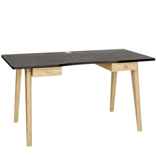 Il piano del tavolo è realizzato in truciolare impiallacciato di rovere, verniciato con vernice trasparente (lucido 10%). I cassetti e il corpo sono realizzati in truciolare impiallacciato di rovere, verniciato con vernice trasparente (lucido 10%). Struttura delle gambe in massello di rovere, verniciato con lacca trasparente (lucentezza 10%). Maniglie in ottone massiccio..